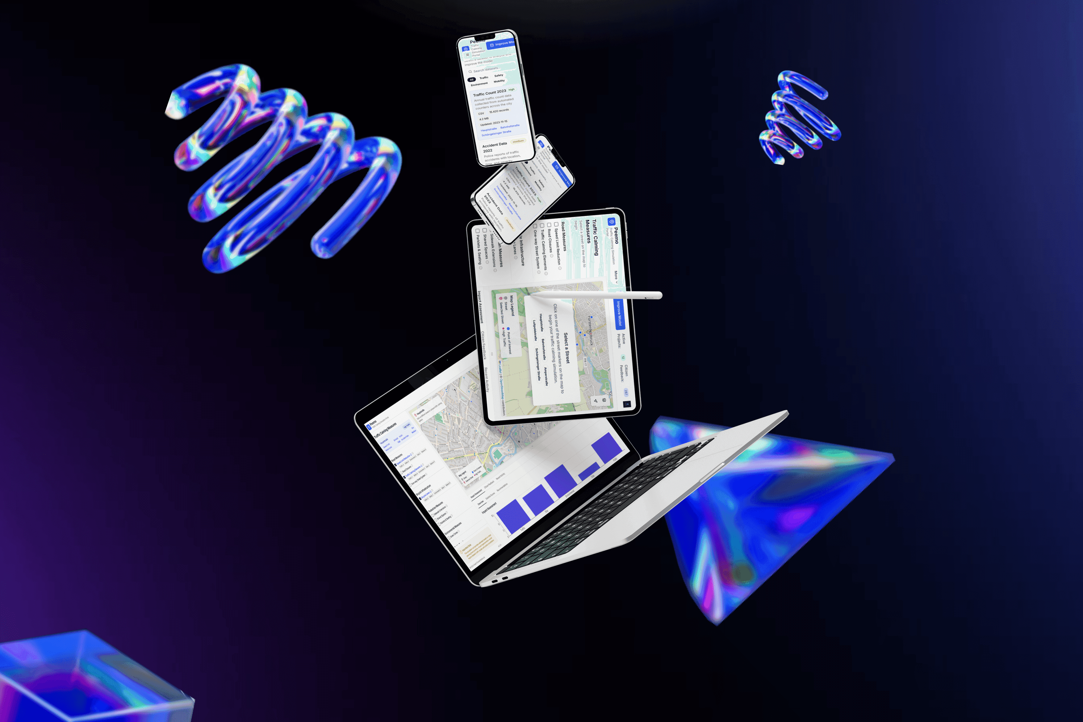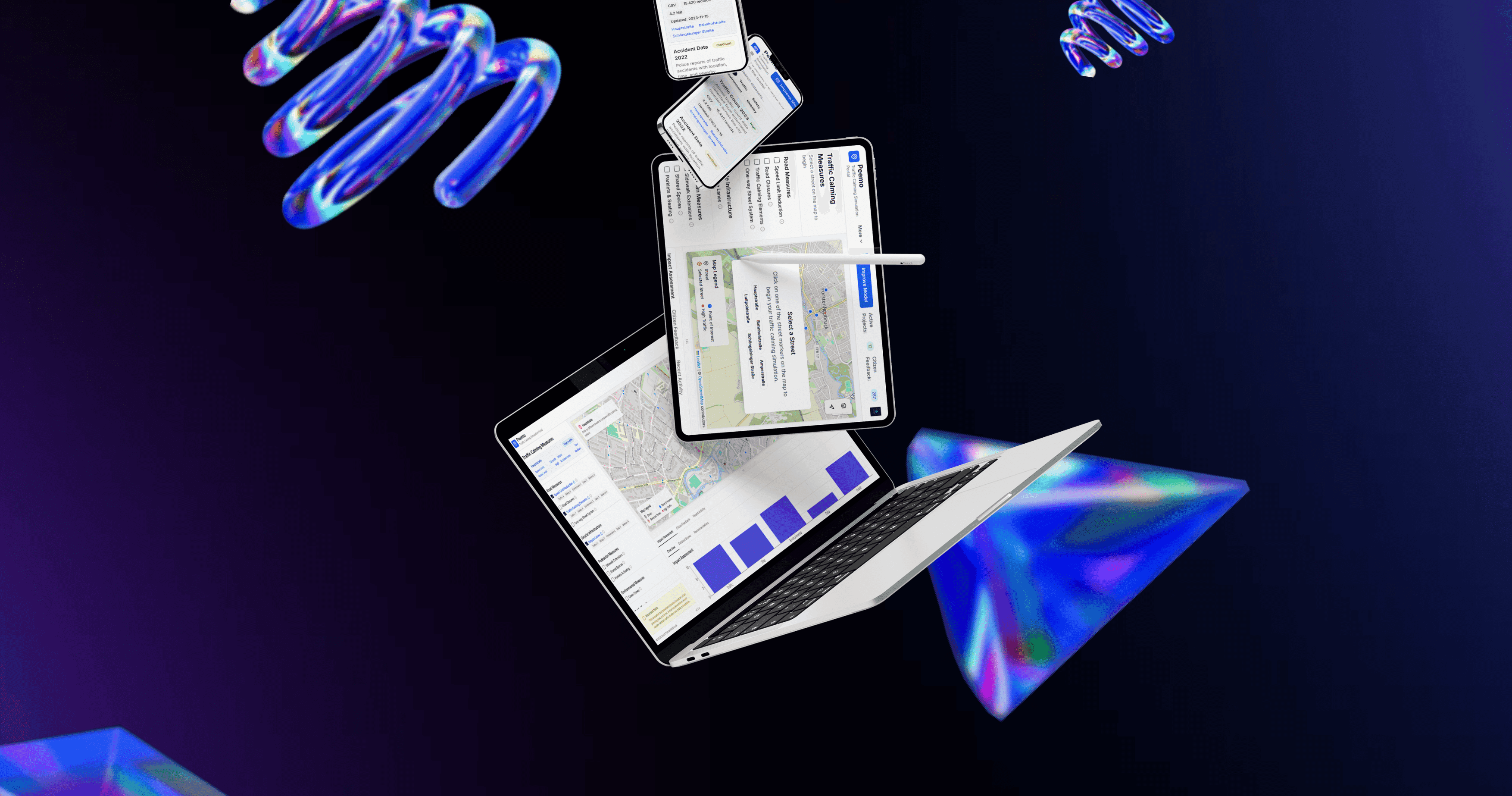 Our Traffic Calming Simulation Portal is an interactive web application that enables users to analyze and predict the impact of traffic-calming interventions in urban environments. Using real-time and historical data on traffic volumes, noise levels, emissions, and user feedback, the portal simulates various scenarios such as modal shifts, improved air quality, or pedestrian safety enhancements. The tool provides intuitive visualizations including interactive maps, timeline sliders, and performance dashboards to support evidence-based decision-making for city planners, researchers, and citizens. Additionally, the platform includes a public feedback module to capture perceptions of change and gauge acceptance. By combining environmental analytics, mobility data, and user experience, PEEMO aims to support sustainable and citizen-friendly city transformation.