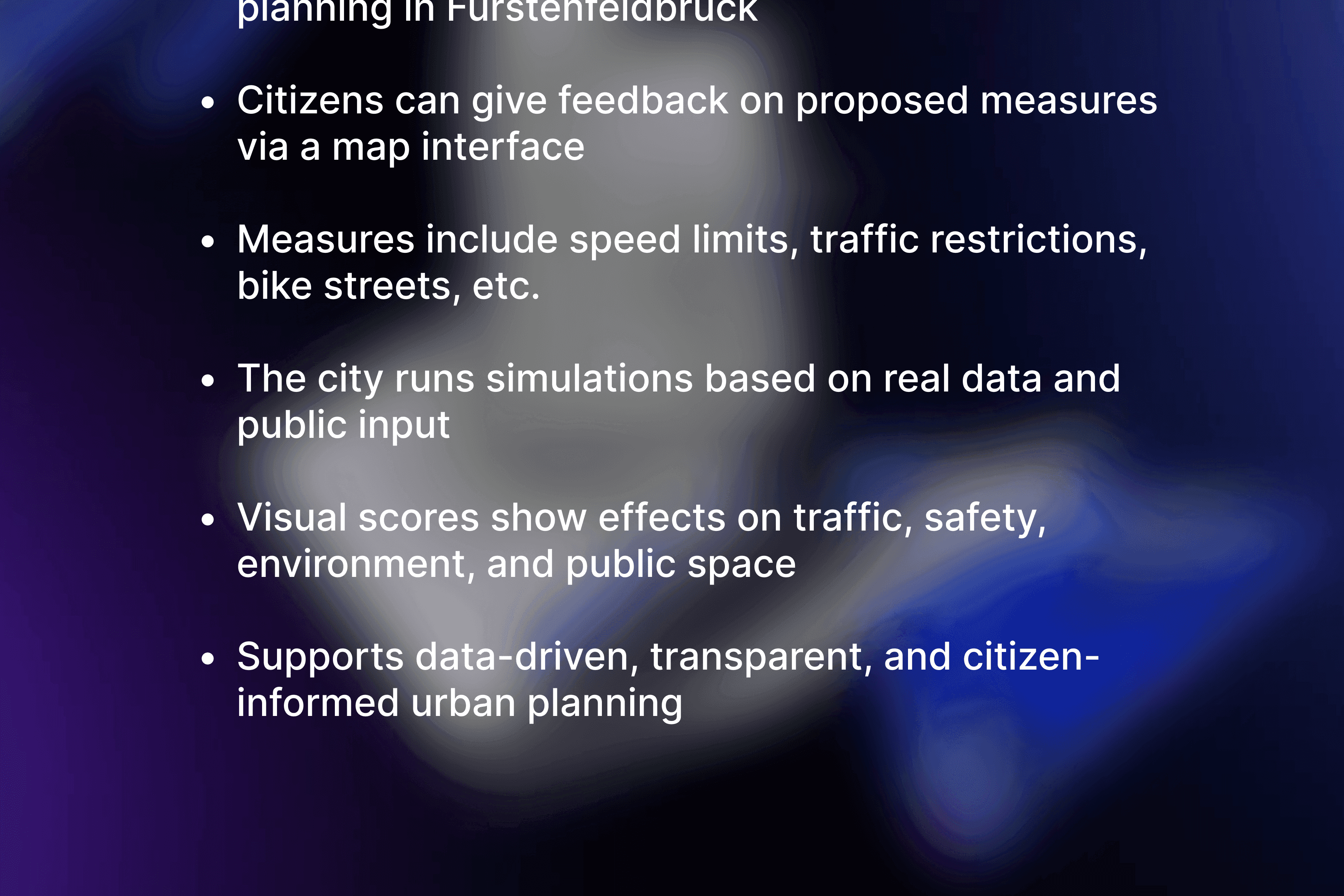 Interactive web platform simulating traffic calming impacts in Fürstenfeldbruck, combining data analysis and citizen feedback for better planning.