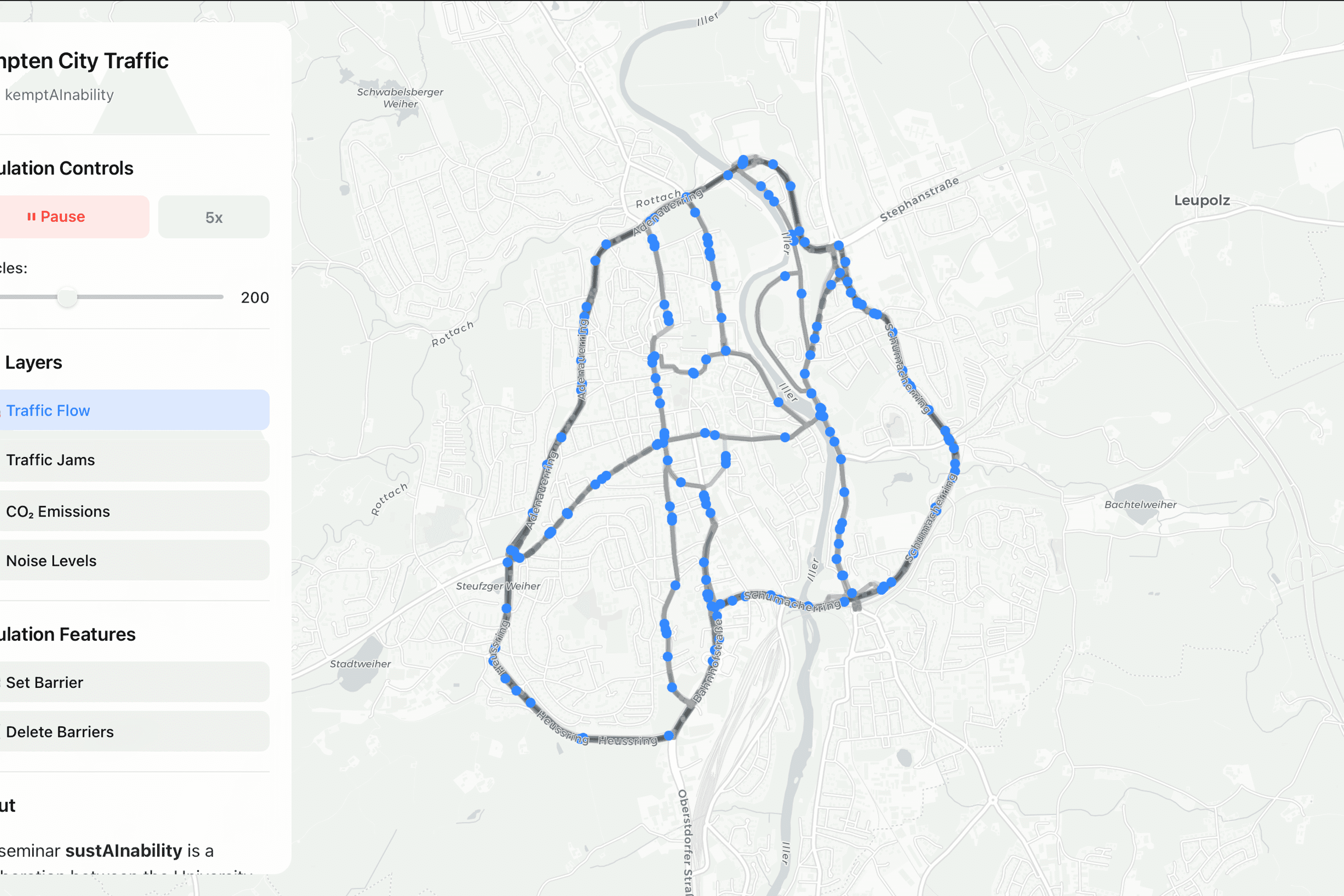 We have implemented an interactive traffic simulation with a generic aspect, which is currently focused on the city of Kempten. It shows how traffic flows over a specific time period and how this changes when a particular road is blocked, as well as the effect this has on traffic delays, CO emissions and noise pollution. It has been developed not only for citizens, who can engage with it by testing it interactively in Kempten's Future Lab, but also to convince political opinion leaders and showcase the positive impact on quality of life and a greener city centre. Our cost-effective simulation can be easily used by end consumers, not only tech-affines, once set up.
